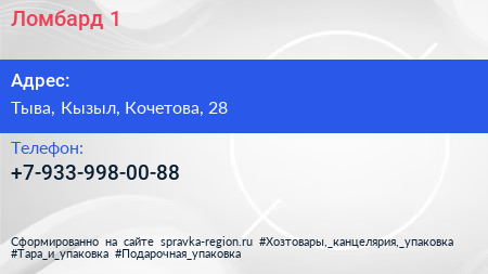 Ломбард №1 по адресу Тыва, Кызыл, Кочетова, 28 в дальнейшем Организация, размещена в следующих категориях: