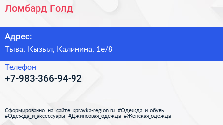 Ломбард Голд по адресу Тыва, Кызыл, Калинина, 1е/8 в дальнейшем Организация, размещена в следующих категориях: