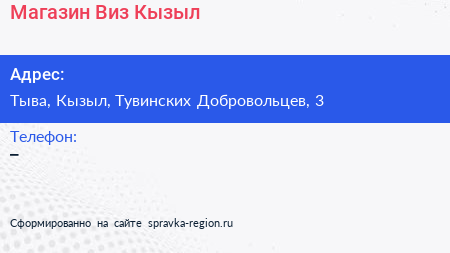 Магазин Виз-Кызыл по адресу Тыва, Кызыл, Тувинских Добровольцев, 3 в дальнейшем Организация, размещена в следующих категориях: