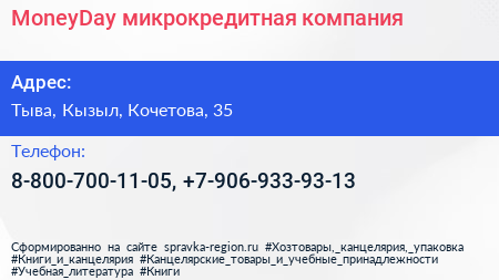 MoneyDay, микрокредитная компания по адресу Тыва, Кызыл, Кочетова, 35 в дальнейшем Организация, размещена в следующих категориях: