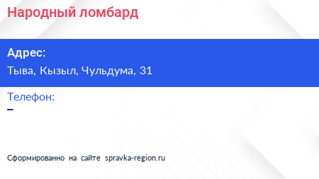Народный ломбард по адресу Тыва, Кызыл, Чульдума, 31 в дальнейшем Организация, размещена в следующих категориях: