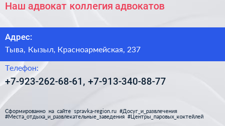 Наш адвокат, коллегия адвокатов по адресу Тыва, Кызыл, Красноармейская, 237 в дальнейшем Организация, размещена в следующих категориях: