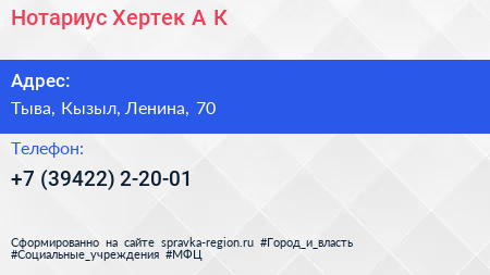 Нотариус Хертек А.К. по адресу Тыва, Кызыл, Ленина, 70 в дальнейшем Организация, размещена в следующих категориях: