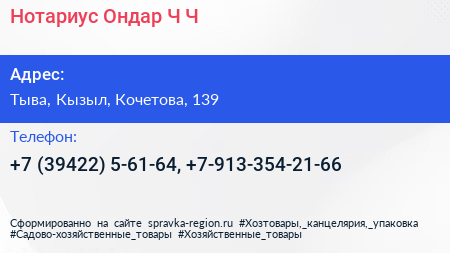 Нотариус Ондар Ч.Ч. по адресу Тыва, Кызыл, Кочетова, 139 в дальнейшем Организация, размещена в следующих категориях: