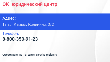 ОК+, юридический центр по адресу Тыва, Кызыл, Калинина, 3/2 в дальнейшем Организация, размещена в следующих категориях: