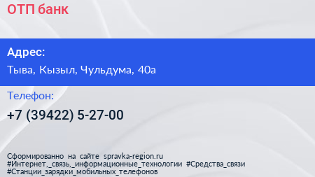 ОТП банк по адресу Тыва, Кызыл, Чульдума, 40а в дальнейшем Организация, размещена в следующих категориях: