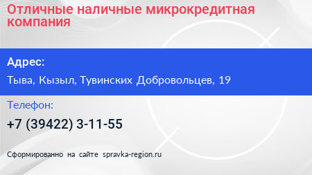 Отличные наличные, микрокредитная компания по адресу Тыва, Кызыл, Тувинских Добровольцев, 19 в дальнейшем Организация, размещена в следующих категориях: