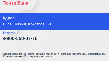 Почта Банк по адресу Тыва, Кызыл, Кочетова, 53 в дальнейшем Организация, размещена в следующих категориях: