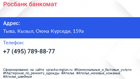 Росбанк, банкомат по адресу Тыва, Кызыл, Оюна Курседи, 159а в дальнейшем Организация, размещена в следующих категориях: