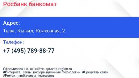 Росбанк, банкомат по адресу Тыва, Кызыл, Колхозная, 2 в дальнейшем Организация, размещена в следующих категориях:
