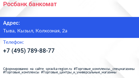 Росбанк, банкомат по адресу Тыва, Кызыл, Колхозная, 2а в дальнейшем Организация, размещена в следующих категориях: