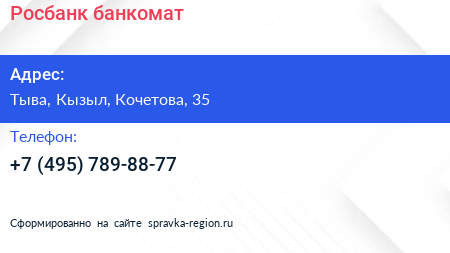 Росбанк, банкомат по адресу Тыва, Кызыл, Кочетова, 35 в дальнейшем Организация, размещена в следующих категориях: