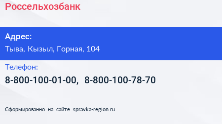 Россельхозбанк по адресу Тыва, Кызыл, Горная, 104 в дальнейшем Организация, размещена в следующих категориях:
