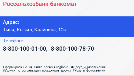 Россельхозбанк, банкомат по адресу Тыва, Кызыл, Калинина, 10а в дальнейшем Организация, размещена в следующих категориях: