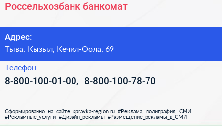 Россельхозбанк, банкомат по адресу Тыва, Кызыл, Кечил-Оола, 69 в дальнейшем Организация, размещена в следующих категориях: