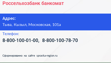 Россельхозбанк, банкомат по адресу Тыва, Кызыл, Московская, 101а в дальнейшем Организация, размещена в следующих категориях: