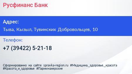 Русфинанс Банк по адресу Тыва, Кызыл, Тувинских Добровольцев, 10 в дальнейшем Организация, размещена в следующих категориях: