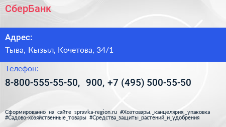 СберБанк по адресу Тыва, Кызыл, Кочетова, 34/1 в дальнейшем Организация, размещена в следующих категориях: