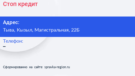 Стоп кредит по адресу Тыва, Кызыл, Магистральная, 22Б в дальнейшем Организация, размещена в следующих категориях: