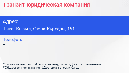 Транзит, юридическая компания по адресу Тыва, Кызыл, Оюна Курседи, 151 в дальнейшем Организация, размещена в следующих категориях: