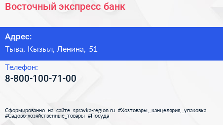Восточный экспресс банк по адресу Тыва, Кызыл, Ленина, 51 в дальнейшем Организация, размещена в следующих категориях:
