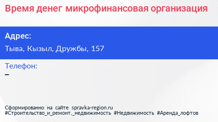 Время денег, микрофинансовая организация по адресу Тыва, Кызыл, Дружбы, 157 в дальнейшем Организация, размещена в следующих категориях: