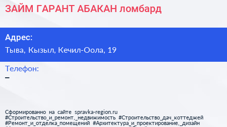 ЗАЙМ ГАРАНТ АБАКАН, ломбард по адресу Тыва, Кызыл, Кечил-Оола, 19 в дальнейшем Организация, размещена в следующих категориях: