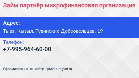 Займ партнёр, микрофинансовая организация по адресу Тыва, Кызыл, Тувинских Добровольцев, 19 в дальнейшем Организация, размещена в следующих категориях:
