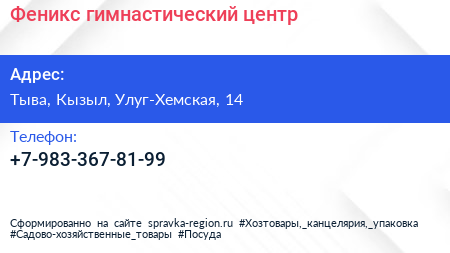 Феникс, гимнастический центр по адресу Тыва, Кызыл, Улуг-Хемская, 14 в дальнейшем Организация, размещена в следующих категориях:
