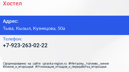 Хостел по адресу Тыва, Кызыл, Кузнецова, 50а в дальнейшем Организация, размещена в следующих категориях: