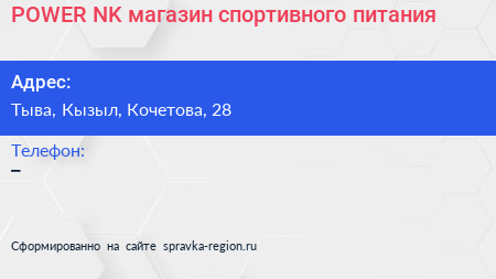 POWER-NK, магазин спортивного питания по адресу Тыва, Кызыл, Кочетова, 28 в дальнейшем Организация, размещена в следующих категориях:
