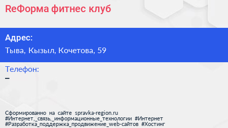 ReФорма, фитнес-клуб по адресу Тыва, Кызыл, Кочетова, 59 в дальнейшем Организация, размещена в следующих категориях: