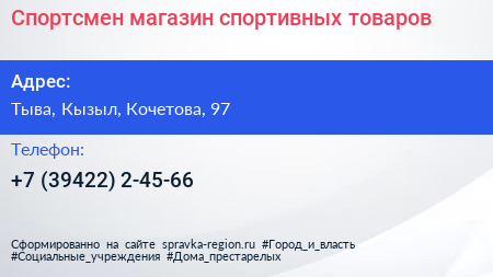Спортсмен, магазин спортивных товаров по адресу Тыва, Кызыл, Кочетова, 97 в дальнейшем Организация, размещена в следующих категориях: