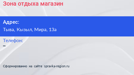 Зона отдыха, магазин по адресу Тыва, Кызыл, Мира, 13а в дальнейшем Организация, размещена в следующих категориях: