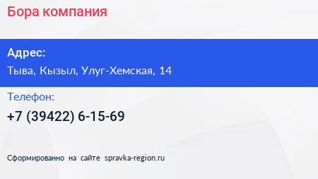 Бора, компания по адресу Тыва, Кызыл, Улуг-Хемская, 14 в дальнейшем Организация, размещена в следующих категориях: