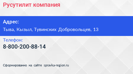 Русутилит, компания по адресу Тыва, Кызыл, Тувинских Добровольцев, 13 в дальнейшем Организация, размещена в следующих категориях: