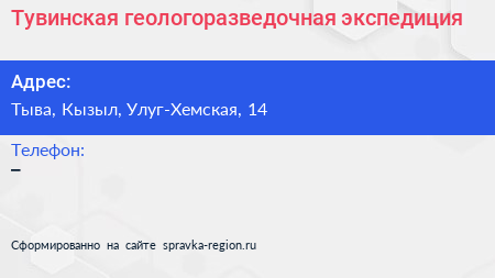 Тувинская геологоразведочная экспедиция по адресу Тыва, Кызыл, Улуг-Хемская, 14 в дальнейшем Организация, размещена в следующих категориях: