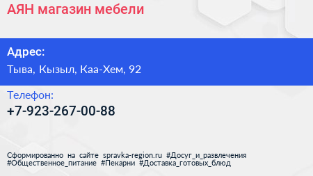 АЯН, магазин мебели по адресу Тыва, Кызыл, Каа-Хем, 92 в дальнейшем Организация, размещена в следующих категориях: