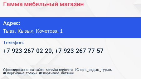 Гамма, мебельный магазин по адресу Тыва, Кызыл, Кочетова, 1 в дальнейшем Организация, размещена в следующих категориях: