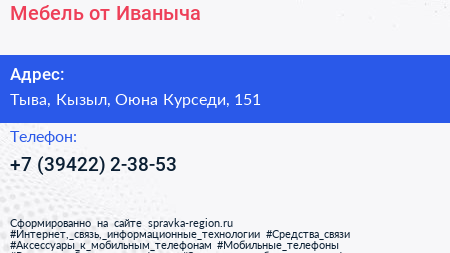 Мебель от Иваныча по адресу Тыва, Кызыл, Оюна Курседи, 151 в дальнейшем Организация, размещена в следующих категориях: