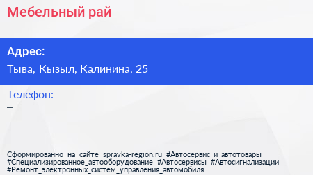 Мебельный рай по адресу Тыва, Кызыл, Калинина, 25 в дальнейшем Организация, размещена в следующих категориях: