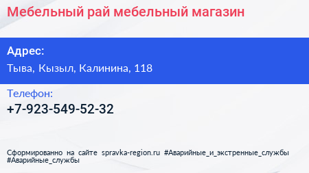Мебельный рай, мебельный магазин по адресу Тыва, Кызыл, Калинина, 118 в дальнейшем Организация, размещена в следующих категориях: