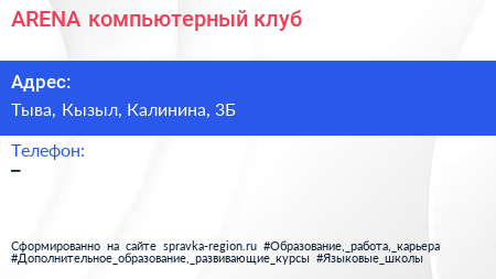 ARENA, компьютерный клуб по адресу Тыва, Кызыл, Калинина, 3Б в дальнейшем Организация, размещена в следующих категориях: