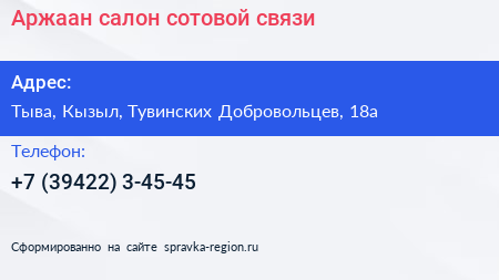 Аржаан, салон сотовой связи по адресу Тыва, Кызыл, Тувинских Добровольцев, 18а в дальнейшем Организация, размещена в следующих категориях: