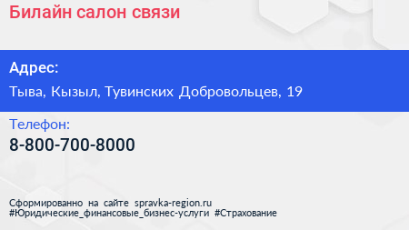 Билайн, салон связи по адресу Тыва, Кызыл, Тувинских Добровольцев, 19 в дальнейшем Организация, размещена в следующих категориях: