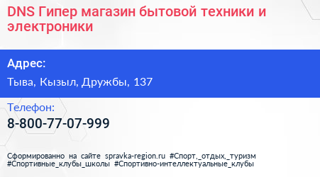 DNS Гипер, магазин бытовой техники и электроники по адресу Тыва, Кызыл, Дружбы, 137 в дальнейшем Организация, размещена в следующих категориях: