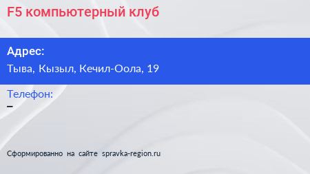 F5, компьютерный клуб по адресу Тыва, Кызыл, Кечил-Оола, 19 в дальнейшем Организация, размещена в следующих категориях: