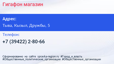 Гигафон, магазин по адресу Тыва, Кызыл, Дружбы, 5 в дальнейшем Организация, размещена в следующих категориях: