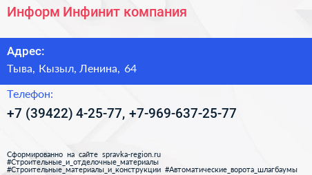 Информ Инфинит, компания по адресу Тыва, Кызыл, Ленина, 64 в дальнейшем Организация, размещена в следующих категориях: