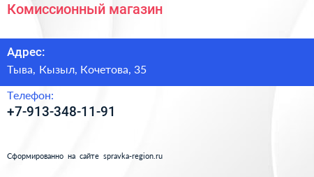 Комиссионный магазин по адресу Тыва, Кызыл, Кочетова, 35 в дальнейшем Организация, размещена в следующих категориях: